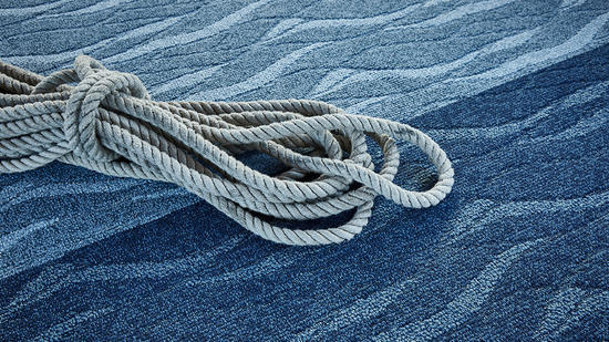 The DESSO Tide carpet collection is especially developed for marine, its design lends a feeling of rippling waters to the indoors with its subtly layered wavy design. Like the tidal ridges of the seabed, this textured carpet allows you to play with the space to create a serene flooring with a nautical look. Bring the ocean to your room with four nautical colours; dark and light blue, dark and light grey.