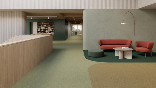 The DESSO by Tarkett Origin family is a true embodiment of our Beauty of Circularity philosophy. Emerge is made to be remade in an endless closed-loop cycle. Just like Origin’s Evolve, Recharge, and Retrace carpet tile collections, its design takes inspiration from the circular process itself. Emerge’s subtle, material-rich design reflects the texture and pattern of reclaimed carpet yarns, with base tones complemented by colour accents in intermittent strokes. With 16 base and accent tones—and 32 neutral colours across Emerge and Evolve—these collections offer versatile coordination potential. By focusing on softer tonal ranges, Emerge and Evolve create harmonious combinations and provide a pleasing contrast to the more vivid hues found in Recharge and Retrace.